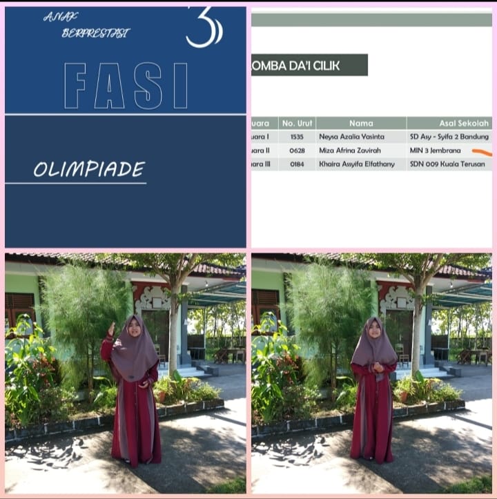 kali ini Miza Afrina Zavira telah berhasil meraih Juara 2 Da’i Cilik Nasional, dari jumlah peserta mencapai kurang lebih 2.367 seluruh Indonesia dari berbagai jenis lomba. Lomba yang diadakan SMP Cendekia Madani Metro dalam Ajang FASI (Festival Anak Berprestasi). Mandiri, Selengkapnya